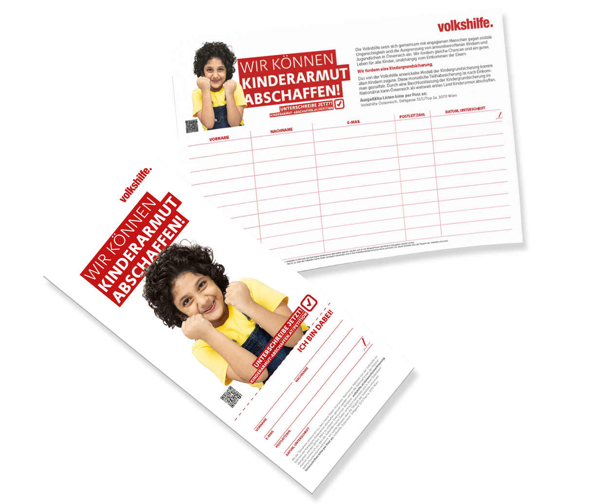 Bestelle dir Unterschriften-Karten, um unter Freund*innen, am Arbeitsplatz, an der Schule oder Universität zu sammeln. Den Abriss kannst du als Info weitergeben, die Unterschrift bei dir behalten. Ebenfalls haben wir Unterschriften-Listen erstellt, die du verwenden kannst. Wenn du Karten oder Listen gesammelt hast, sende diese an: Volkshilfe Österreich, Stiftgasse 31/1/Top 1a, 1070 Wien.