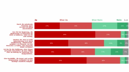 Ebenfalls 91 % halten eine Sozialhilfe, die Armut und Ausgrenzung verhindert, für eine zentrale staatliche Aufgabe. 74 % sprechen sich dafür aus, arbeitslose Menschen stärker zu unterstützen – etwa durch Qualifizierungs- und Arbeitsmarktprogramme. Besonders Menschen mit geringem Einkommen fordern mit 92 % Zustimmung gezielte Hilfe, um langfristig Arbeit zu finden.